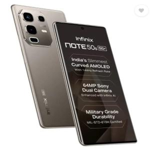 Brand: Infinix Model: Note 50S 5G+ (X6870) Display: 6.78" FHD+ Curved AMOLED, 144Hz, 1300 nits, Gorilla Glass 5 Chipset: MediaTek Dimensity 7300 Ultimate (4nm) RAM & Storage: 6GB RAM | 128GB ROM (UFS 2.2) | Expandable RAM via MemFusion Rear Camera: 64MP Sony IMX682 + 2MP Macro | Dual LED Flash Front Camera: 13MP | 4K Video | Screen Flash Battery: 5500mAh with 45W Fast Charging + 10W Reverse Charging Operating System: Android 15 with XOS 15 Network: 5G, 4G LTE, Dual VoLTE, WiFi 6, Bluetooth 5.4 Security: In-display Fingerprint + Face Unlock Build: 7.6mm Slim | 180g | IP64 | MIL-STD-810H Other Features: JBL Audio, IR Blaster, AI Wallpaper Generator, Folax Assistant, Active Halo Light